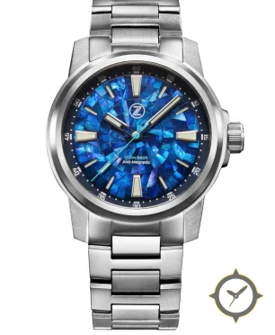 Eine Sport-Uhr mit einem markanten 41.5mm Auftritt am Handgelenk, gefertigt aus Edelstahl mit einem Zifferblatt in blau und einer besonderen "mother-of-pearl mosaic"-Oberfläche.