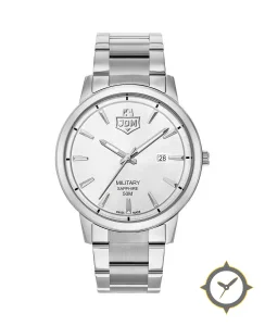 Eine Militär-Uhr mit einem vielseitigen 38mm Gehäuse, das an fast jedes Handgelenk passt, gefertigt aus Edelstahl mit einem Zifferblatt in silber und einer besonderen "brushed-sunburst"-Oberfläche.