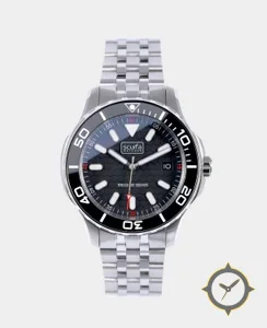 Eine Taucheruhr-Uhr mit einem 37.5mm Gehäuse im Vintage-Stil gefertigt aus Edelstahl mit einem Zifferblatt in schwarz und einer besonderen "hexagonal honeycomb texture"-Oberfläche.