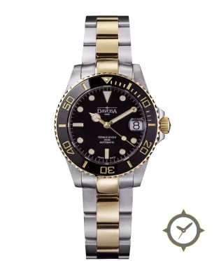 Eine Taucheruhr-Uhr mit einem vielseitigen 40mm Gehäuse, das an fast jedes Handgelenk passt, gefertigt aus Edelstahl mit einem Zifferblatt in schwarz und einer besonderen "glossy"-Oberfläche.