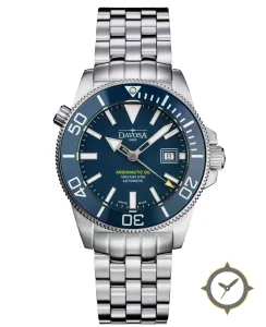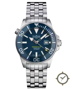 Eine Taucheruhr-Uhr mit einem markanten 45mm Auftritt am Handgelenk, gefertigt aus Edelstahl mit einem Zifferblatt in blau und einer besonderen "sunburst"-Oberfläche.