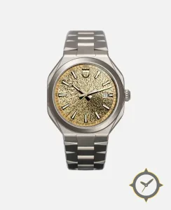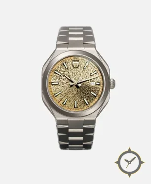 Eine Sport-Uhr mit einem vielseitigen 39mm Gehäuse, das an fast jedes Handgelenk passt, gefertigt aus Titan mit einem Zifferblatt in gold und einer besonderen "highly textured, radial mosaic / woven pattern"-Oberfläche.