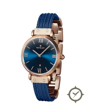 Eine Dress-Uhr mit einem 34.5mm Gehäuse im Vintage-Stil gefertigt aus Edelstahl mit einem Zifferblatt in blau und einer besonderen "sunburst"-Oberfläche.