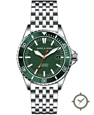 Eine Taucheruhr-Uhr mit einem vielseitigen 41mm Gehäuse, das an fast jedes Handgelenk passt, gefertigt aus Edelstahl mit einem Zifferblatt in grün und einer besonderen "textured-grain"-Oberfläche.