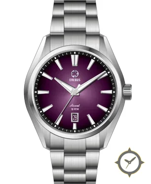 Eine Sport-Uhr mit einem 36.5mm Gehäuse im Vintage-Stil gefertigt aus Edelstahl mit einem Zifferblatt in lila und einer besonderen "sunburst"-Oberfläche.