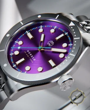 Eine Taucheruhr-Uhr mit einem vielseitigen 40.5mm Gehäuse, das an fast jedes Handgelenk passt, gefertigt aus Edelstahl mit einem Zifferblatt in lila und einer besonderen "sunburst"-Oberfläche.