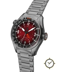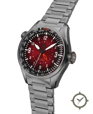 Eine GMT-Uhr mit einem markanten 46mm Auftritt am Handgelenk, gefertigt aus Edelstahl mit einem Zifferblatt in rot und einer besonderen "sunburst"-Oberfläche, ideal für Weltenbummler dank der Weltzeit-Funktion.