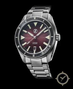 Eine Taucheruhr-Uhr mit einem 34.5mm Gehäuse im Vintage-Stil gefertigt aus Edelstahl mit einem Zifferblatt in rot und einer besonderen "sunburst radial"-Oberfläche.