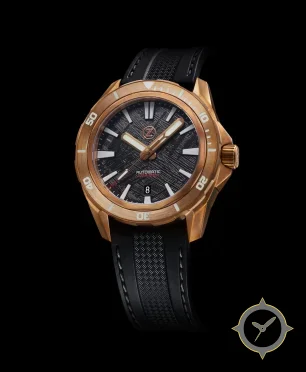 Eine Taucheruhr-Uhr mit einem markanten 50.5mm Auftritt am Handgelenk, gefertigt aus Bronze mit einem Zifferblatt in schwarz und einer besonderen "meteorite-style textured / cross-hatch"-Oberfläche.