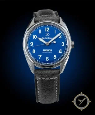 Eine Field-Uhr mit einem 30.5mm Gehäuse im Vintage-Stil gefertigt aus Edelstahl mit einem Zifferblatt in blau und einer besonderen "radial sunburst"-Oberfläche.