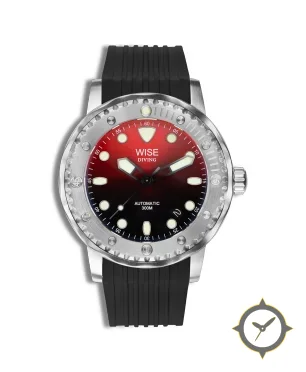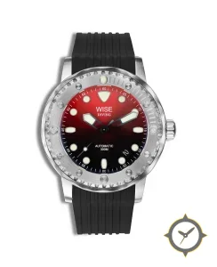 Eine Taucheruhr-Uhr mit einem markanten 44.5mm Auftritt am Handgelenk, gefertigt aus Edelstahl mit einem Zifferblatt in rot und einer besonderen "sunburst gradient (red to black)"-Oberfläche.
