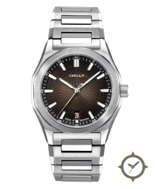 Eine Sport-Uhr mit einem markanten 44mm Auftritt am Handgelenk, gefertigt aus Edelstahl mit einem Zifferblatt in braun und einer besonderen "concentric textured mosaic / guilloché"-Oberfläche und einer echten GMT-Funktion, mit der du eine zweite Zeitzone verfolgen kannst.