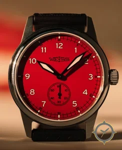 Eine Pilot-Uhr mit einem 35.5mm Gehäuse im Vintage-Stil gefertigt aus Edelstahl mit einem Zifferblatt in rot und einer besonderen "matte"-Oberfläche.