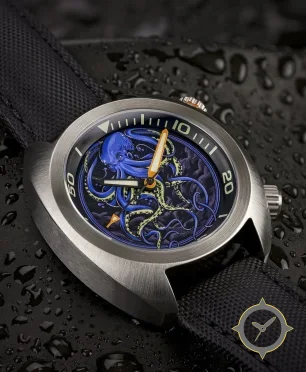 Eine Taucheruhr-Uhr mit einem 36.5mm Gehäuse im Vintage-Stil gefertigt aus Edelstahl mit einem Zifferblatt in blau und einer besonderen "hand-painted / engraved octopus motif (textured enamel-like finish)"-Oberfläche.