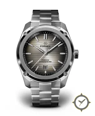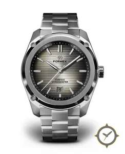 Eine Sport-Uhr mit einem markanten 49.5mm Auftritt am Handgelenk, gefertigt aus Edelstahl mit einem Zifferblatt in grau und einer besonderen "horizontal brushed"-Oberfläche.