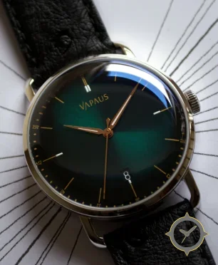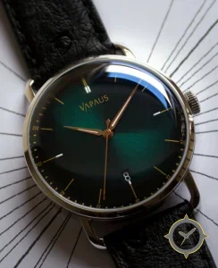 Eine Dress-Uhr mit einem markanten 41.5mm Auftritt am Handgelenk, gefertigt aus Edelstahl mit einem Zifferblatt in türkis und einer besonderen "radial sunburst"-Oberfläche.