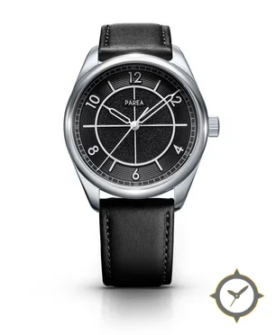 Eine Dress-Uhr mit einem markanten 43mm Auftritt am Handgelenk, gefertigt aus Edelstahl mit einem Zifferblatt in schwarz und einer besonderen "grained centre with concentric ring texture"-Oberfläche.