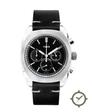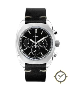 Eine Chronograph-Uhr mit einem 37mm Gehäuse im Vintage-Stil gefertigt aus Edelstahl mit einem Zifferblatt in schwarz und einer besonderen "matte"-Oberfläche.