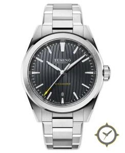 Eine Sport-Uhr mit einem vielseitigen 39.5mm Gehäuse, das an fast jedes Handgelenk passt, gefertigt aus Edelstahl mit einem Zifferblatt in grau und einer besonderen "vertical embossed grooves (teak-style)"-Oberfläche.