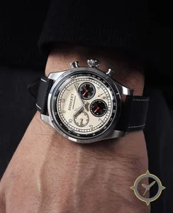Eine Chronograph-Uhr mit einem 33.5mm Gehäuse im Vintage-Stil gefertigt aus Edelstahl mit einem Zifferblatt in weiß und einer besonderen "matte ivory"-Oberfläche.