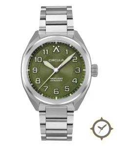 Eine Field-Uhr mit einem 35mm Gehäuse im Vintage-Stil gefertigt aus Edelstahl mit einem Zifferblatt in grün und einer besonderen "textured/grainy with concentric guilloché center"-Oberfläche.