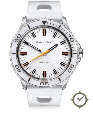 Eine Taucheruhr-Uhr mit einem 34mm Gehäuse im Vintage-Stil gefertigt aus Edelstahl mit einem Zifferblatt in weiß und einer besonderen "matte"-Oberfläche.