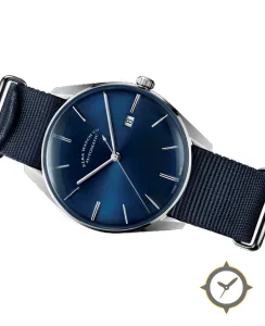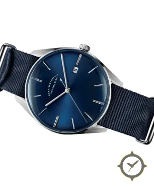 Eine Dress-Uhr mit einem vielseitigen 38mm Gehäuse, das an fast jedes Handgelenk passt, gefertigt aus Edelstahl mit einem Zifferblatt in blau und einer besonderen "sunburst (radial)"-Oberfläche.