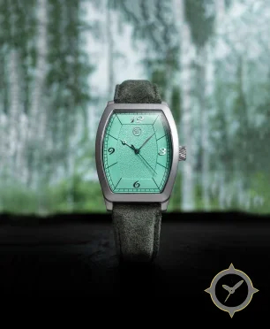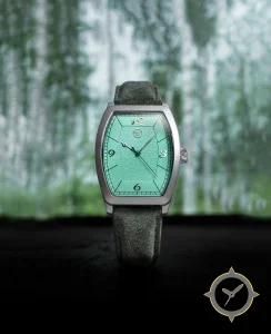 Eine Dress-Uhr mit einem 32.5mm Gehäuse im Vintage-Stil gefertigt aus Edelstahl mit einem Zifferblatt in türkis und einer besonderen "textured/grained (sandpaper-like)"-Oberfläche.