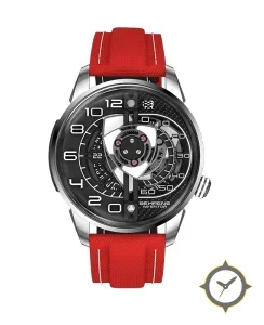 Eine Skelett-Uhr mit einem markanten 45.5mm Auftritt am Handgelenk, gefertigt aus Edelstahl mit einem Zifferblatt in schwarz und einer besonderen "open-worked / skeleton with carbon-fiber accents"-Oberfläche.