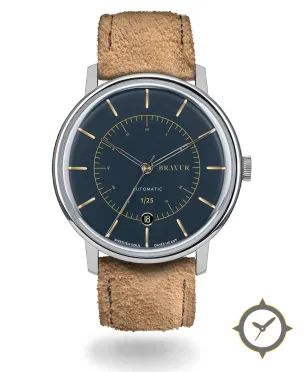 Eine Dress-Uhr mit einem markanten 43mm Auftritt am Handgelenk, gefertigt aus Edelstahl mit einem Zifferblatt in marineblau und einer besonderen "matte"-Oberfläche.