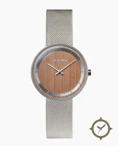 Eine Minimalistisch-Uhr mit einem 27.5mm Gehäuse im Vintage-Stil gefertigt aus Edelstahl mit einem Zifferblatt in braun und einer besonderen "wood grain/veneer"-Oberfläche.
