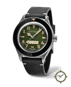 Eine Taucheruhr-Uhr mit einem 35.5mm Gehäuse im Vintage-Stil gefertigt aus Edelstahl mit einem Zifferblatt in grün und einer besonderen "textured waffle / crosshatch"-Oberfläche.