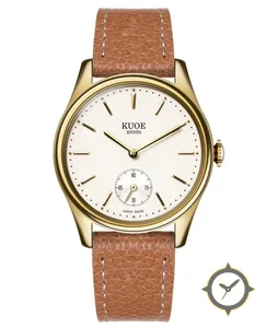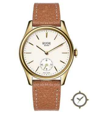 Eine Dress-Uhr mit einem 36.5mm Gehäuse im Vintage-Stil gefertigt aus Gold mit einem Zifferblatt in weiß und einer besonderen "matte lacquer"-Oberfläche.