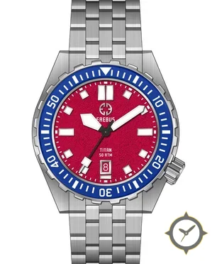 Eine Taucheruhr-Uhr mit einem vielseitigen 41mm Gehäuse, das an fast jedes Handgelenk passt, gefertigt aus Edelstahl mit einem Zifferblatt in rot und einer besonderen "textured/grained finish"-Oberfläche.