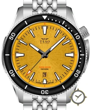 Eine Taucheruhr-Uhr mit einem vielseitigen 39.5mm Gehäuse, das an fast jedes Handgelenk passt, gefertigt aus Edelstahl mit einem Zifferblatt in gelb und einer besonderen "brushed sunburst"-Oberfläche.