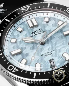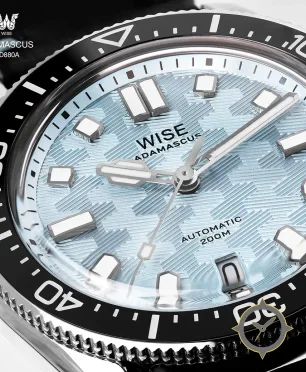 Eine Taucheruhr-Uhr mit einem markanten 44mm Auftritt am Handgelenk, gefertigt aus Edelstahl mit einem Zifferblatt in türkis und einer besonderen "Damascus-style textured pattern with diagonal hatch lines"-Oberfläche.