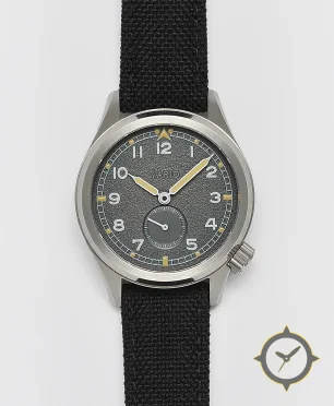 Eine Field-Uhr mit einem vielseitigen 41mm Gehäuse, das an fast jedes Handgelenk passt, gefertigt aus Edelstahl mit einem Zifferblatt in grau und einer besonderen "grained / sandblasted matte finish"-Oberfläche.