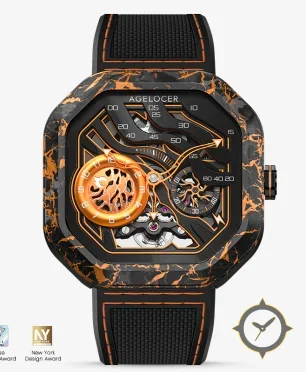 Eine Skelett-Uhr mit einem markanten 52.5mm Auftritt am Handgelenk, gefertigt aus Beschichtung mit einem Zifferblatt in schwarz und einer besonderen "skeletonized/open-worked with layered bridges and orange accents"-Oberfläche.