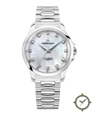 Eine Dress-Uhr mit einem 30mm Gehäuse im Vintage-Stil gefertigt aus Edelstahl mit einem Zifferblatt in weiß und einer besonderen "mother-of-pearl (iridescent)"-Oberfläche.