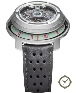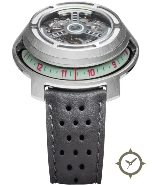 Eine Skelett-Uhr mit einem 35mm Gehäuse im Vintage-Stil gefertigt aus Edelstahl mit einem Zifferblatt in türkis und einer besonderen "open-work skeleton with visible movement and brushed metal surfaces"-Oberfläche.