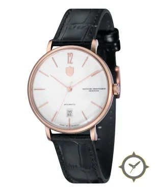 Eine Dress-Uhr mit einem 36.5mm Gehäuse im Vintage-Stil gefertigt aus Edelstahl mit einem Zifferblatt in weiß und einer besonderen "lacquer"-Oberfläche.
