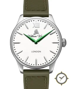 Eine Dress-Uhr mit einem 35mm Gehäuse im Vintage-Stil gefertigt aus Edelstahl mit einem Zifferblatt in weiß und einer besonderen "matte"-Oberfläche.