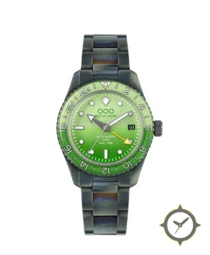 Eine GMT-Uhr mit einem markanten 42.5mm Auftritt am Handgelenk, gefertigt aus Edelstahl mit einem Zifferblatt in grün und einer besonderen "granular, slightly sandblasted finish with a gradient/ombré"-Oberfläche und einer echten GMT-Funktion, mit der du eine zweite Zeitzone verfolgen kannst.