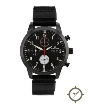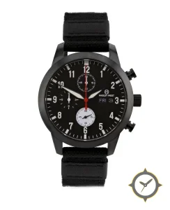 Eine Chronograph-Uhr mit einem markanten 42mm Auftritt am Handgelenk, gefertigt aus Edelstahl mit einem Zifferblatt in schwarz und einer besonderen "matte"-Oberfläche.