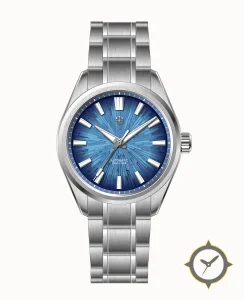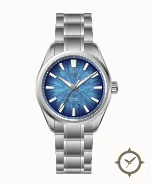 Eine Luxus-Uhr mit einem 32.5mm Gehäuse im Vintage-Stil gefertigt aus Edelstahl mit einem Zifferblatt in blau und einer besonderen "textured radial / fractured starburst (mosaic)"-Oberfläche.