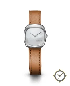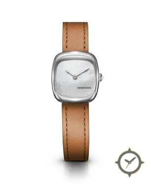 Eine Dress-Uhr mit einem 25mm Gehäuse im Vintage-Stil gefertigt aus Edelstahl mit einem Zifferblatt in weiß und einer besonderen "mother-of-pearl"-Oberfläche.