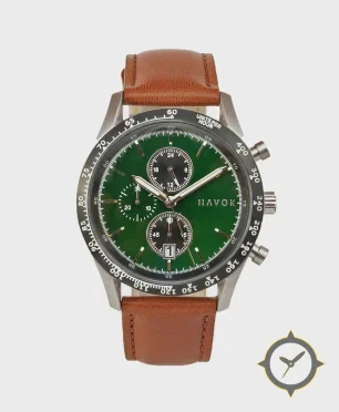 Eine Chronograph-Uhr mit einem markanten 46mm Auftritt am Handgelenk, gefertigt aus Edelstahl mit einem Zifferblatt in grün und einer besonderen "sunburst"-Oberfläche.