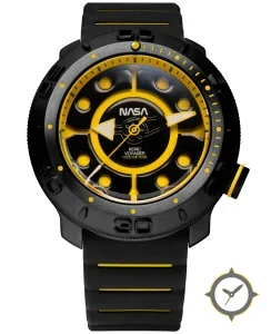 Eine Taucheruhr-Uhr mit einem markanten 41.5mm Auftritt am Handgelenk, gefertigt aus Edelstahl mit einem Zifferblatt in schwarz und einer besonderen "glossy"-Oberfläche.