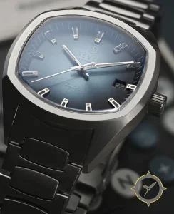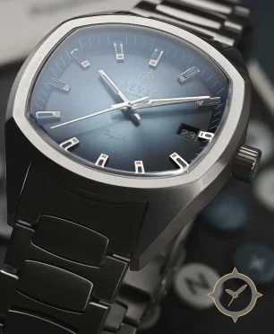 Eine Sport-Uhr mit einem markanten 41.5mm Auftritt am Handgelenk, gefertigt aus Edelstahl mit einem Zifferblatt in blau und einer besonderen "sunburst gradient (fumé)"-Oberfläche.