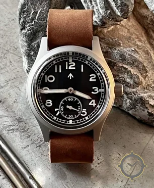 Eine Militär-Uhr mit einem 33mm Gehäuse im Vintage-Stil gefertigt aus Edelstahl mit einem Zifferblatt in schwarz und einer besonderen "matte"-Oberfläche.